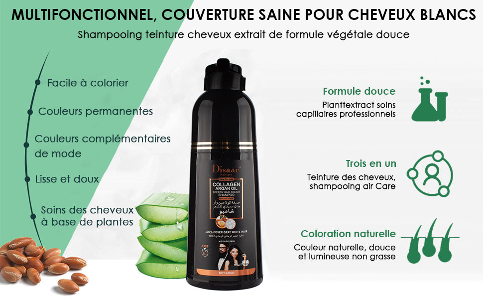 Le Shampooing à l’huile d’argan marocain colore vos cheveux tout en les lavant. En seulement 10 minutes, il couvre vos cheveux blancs avec une teinte noire intense et naturelle, sans produits chimiques agressifs comme l’ammoniaque ou les parabènes. Enrichi en huile d’argan, il hydrate et nourrit profondément vos cheveux, les rendant souples, brillants et plus forts